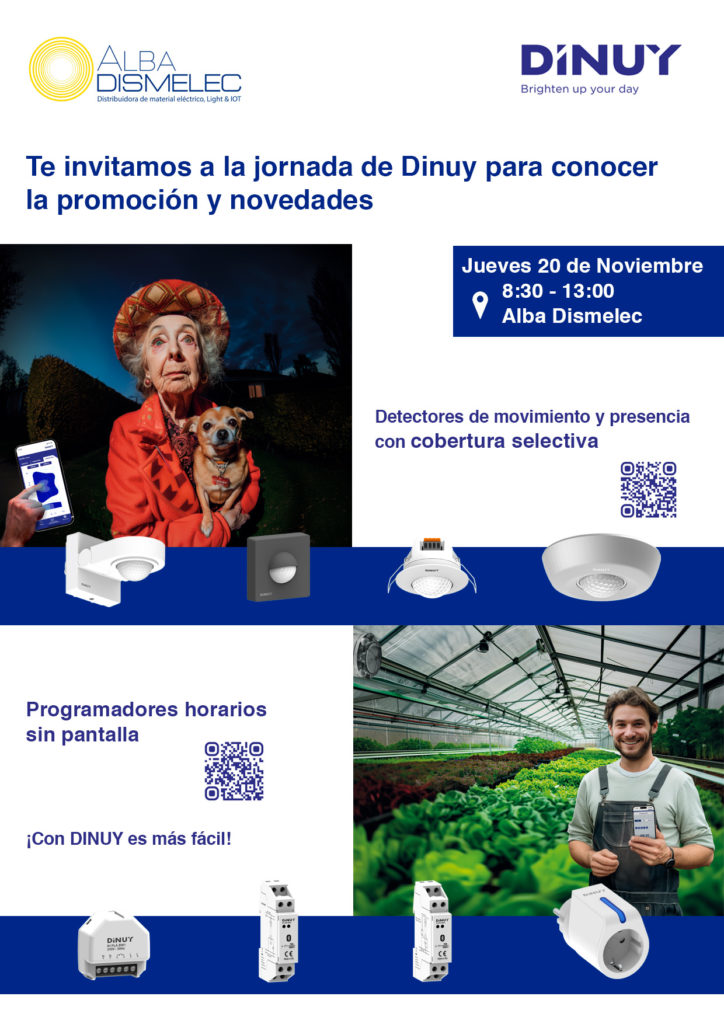 Te invitamos a la presentación de la nueva gama de detectores de movimiento y presencia con cobertura selectiva y programadores horarios DINUY que tendrá lugar en las instalaciones de Alba Dismelec, el próximo jueves 20 de noviembre de 2025 de 8:30 a 13:00.